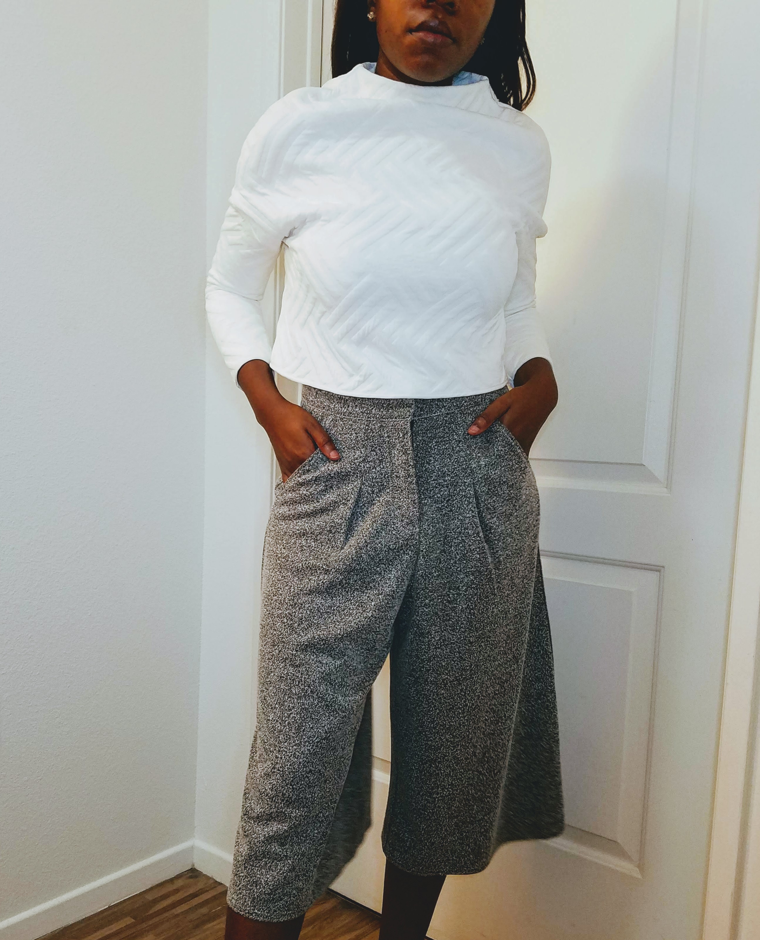 If you want to switch it up from your typical tailored slacks and fitted dress pants, I would opt for wide legged pants instead. It gives your look some flare (no pun intended), pairs well with cropped sweaters/jackets and also serves as a versatile piece in your wardrobe for work events.