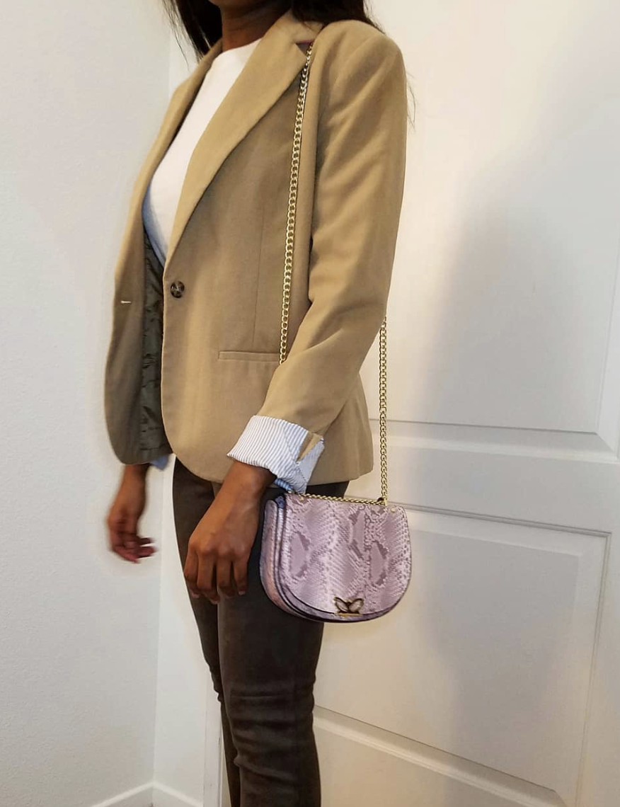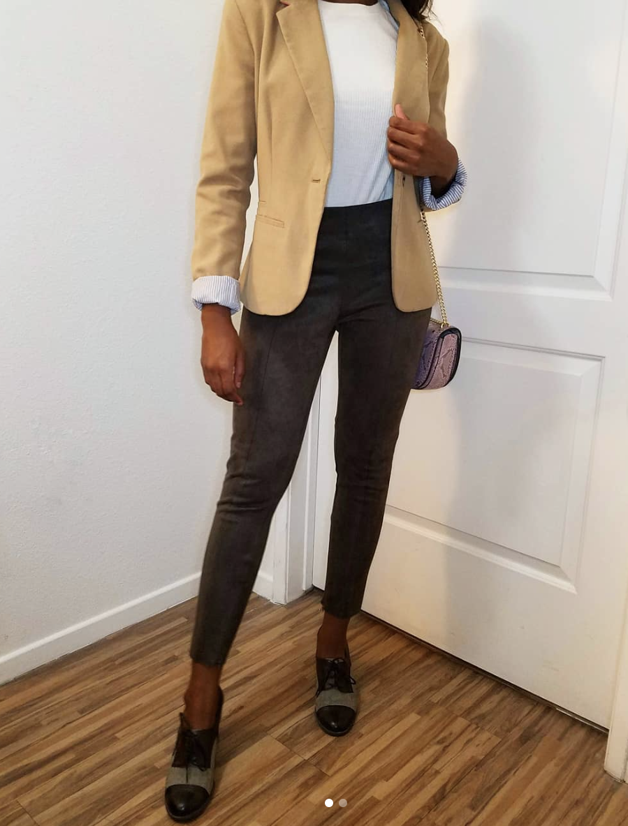 I love caramel/tan/brown hues in the winter. I paired this wool blazer with a ribbed t-shirt and suede leggings. Of course, you can’t go wrong with an oxford shoe, in any form. For a pop of color, I finished the look with a pink snakeskin purse. This was definitely a business casual look, but versatile in the sense that it can be easily dressed up and down. Where I live (Los Angeles) has mild winters, but this suede and wool combo definitely helps me to keep warm!