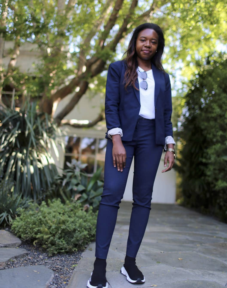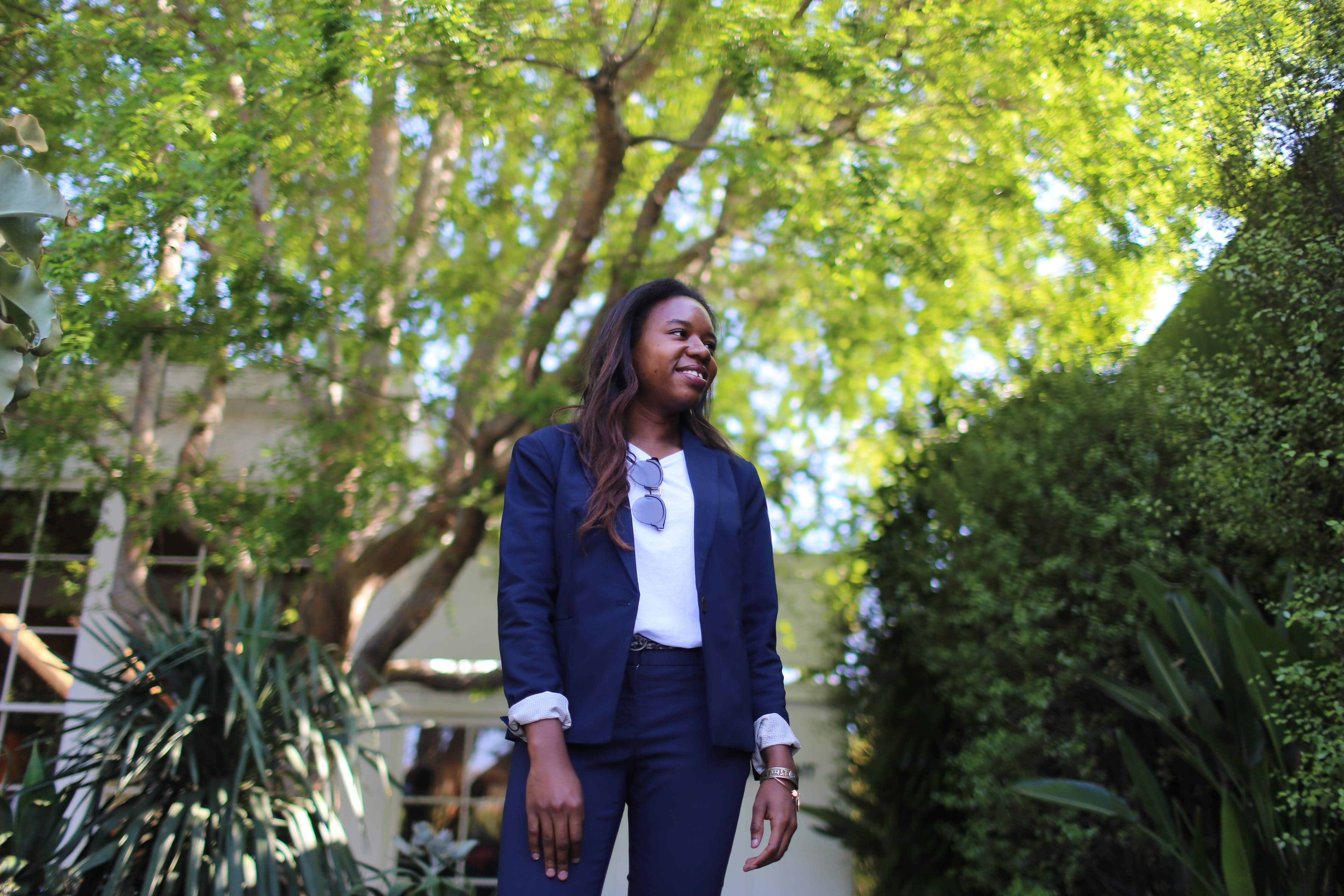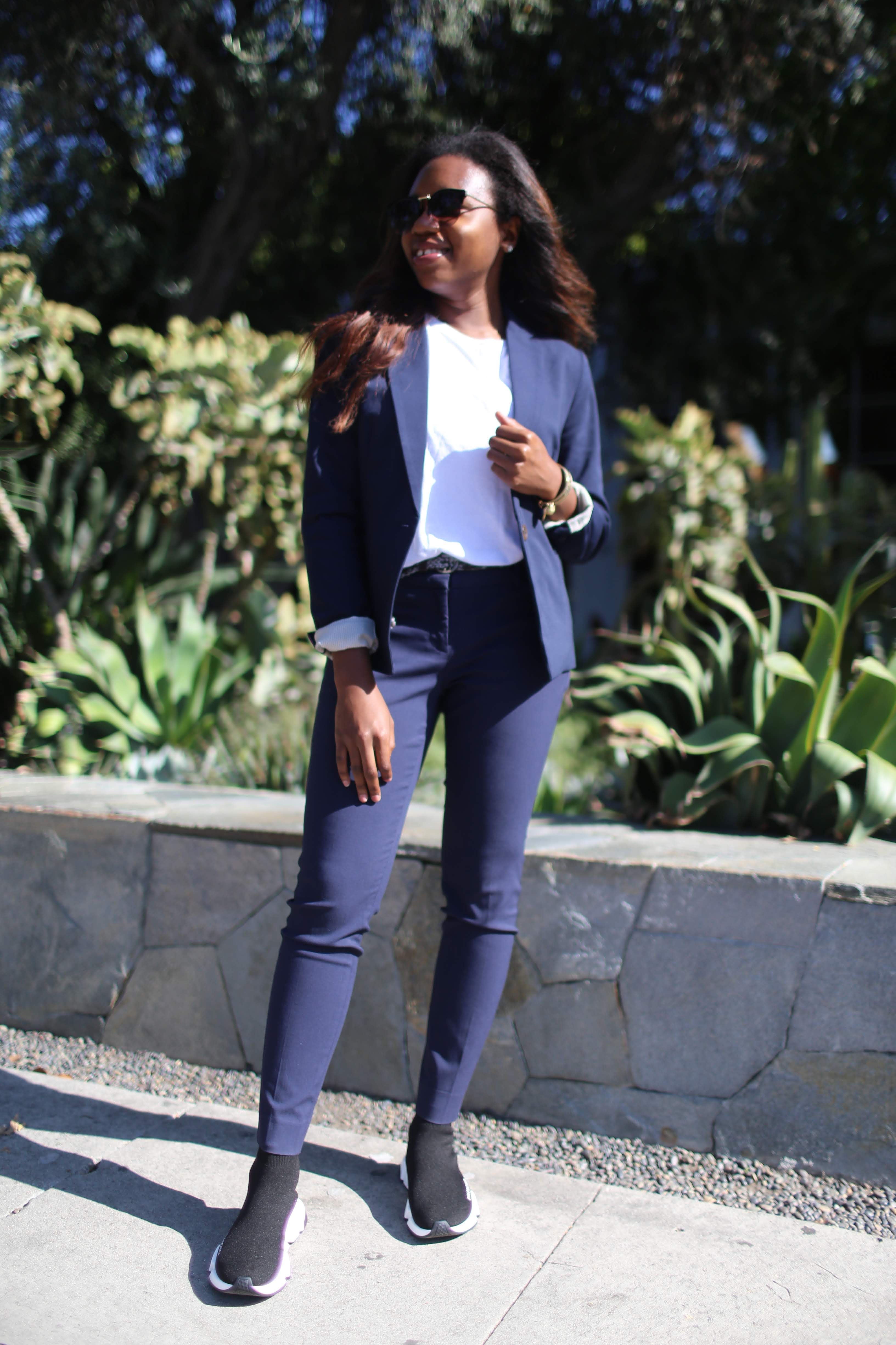 The key to achieving this look is all about finding that happy medium between cool and corporate. For this outfit, I took a navy pant suit (blazer + slacks) and dressed it down by swapping out a button up for a plain white tee. Instead of heels or loafers for shoes, I paired the suit with a sleek pair of trainers. I finished off the look with minimal jewelry and accessories.